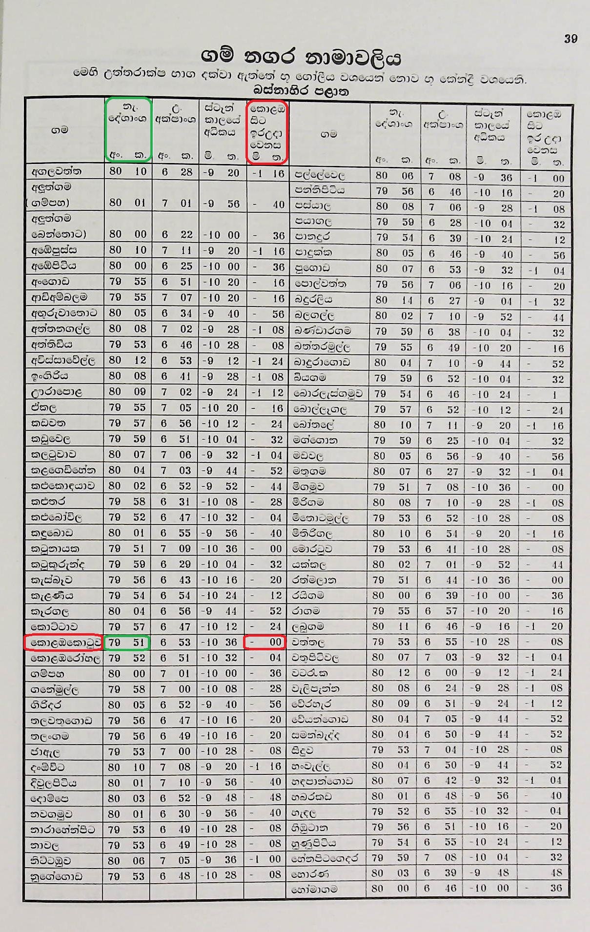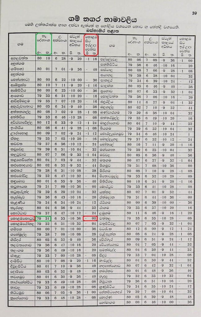 ඉහතින් දක්වා ඇත්තේ 2022 සස 2023 ලංකා පඤ්ඤාංග ග්රහස්ඵුඨ ලිතේ ගම් නගර නාමාවලිය දැක්වෙන පිටු අංක 39 සහ පිටු අංක 42 හි ආදර්ශ ඡායා පිටපත් දෙකකි. ජ්යොතිෂය හදාරන ආධුනික ඔබ සෑම දෙනාම සෑම වර්ෂයකටම අදාල ලංකා පඤ්චාංග ග්රහස්ඵුඨ ලිත් පොතක් අත්යාවශ්යම අත් පොතක් ලෙසින් මිළදී ලඟ තබා ගැනීම අවශ්ය වනු ඇත. මෙම ආදර්ශ පිටපත් දෙකින් එකක් එනම් පිටු අංක 39 බස්නාහිර පළාත නිවේදනය කරන අතර පිටු අංක 42 නැගෙනහිර පළාත නිවේදනය කර ඇත. ලංකා භූමිය පෙන්වන සිතියමේ උපරිම පළල පෙන්වනුයේ කොළඹ කොටුව සහ පොතුවිල් හි පිහිටි සංගමන්කන්ද තුඩුව ස්ථානයයි. පිටු අංක 39 හි ලංකා සිතියමේ බස්නාහිර කෙළවර වූ කොළඹ කොටුවට අදාල දේශාංශක රේඛාව අංශක 79 කලා 51 ලෙස ද, ඉර උදා වෙනස මිනිත්තු 00 තත්පර 00 ලෙස ද දක්වා ඇත. එමෙන්ම පිටු අංක 42 හි ලංකා සිතියමේ නැගෙනහිර අන්තය වූ පොතුවිල් නගරයට අදාල දේශාංශක රේඛාව අංශක 81 කලා 50 ලෙස ද, කොළඹ කොටුව සිට ඉර උදා වෙනස (- මිනිත්තු 7 තත්පර 56) ක් බව ද, දක්වා ඇත. මින් ගම්ය වනුයේ ලංකා සිතියමේ බස්නාහිර අන්තයේ පිහිටි කොළඹ කොටුවට ඉර උදාවීමට මිනිත්තු 07 තත්පර 56 කට පෙර ලංකා සිතියමේ නැගෙනහිර අන්තය වූ පොතුවිල් නගරයට ඉර උදාවන බව ය. මෙයින් අප තේරුම් ගත යුතුව ඇත්තේ ලංකාවේ සෑම නගරයකටම එකවර ඉර උදාව සිදු නොවන අතර එකී ඉර උදාව ගමින් ගමට, නගරයෙන් නගරයට වෙනස් වන බව ය. තවත් අයුරකින් පැවසුවහොත් සෑම ගමකටම, නගරයකටම දවස උදාවනුයේ එකම වේලාවක නොවන බව ය. මේ නිසා ජ්යොතිෂය හදාරන සෑම කෙනෙකුම ඉර උදාව සහ දවසේ උදාව නිවැරදිව ගණනය කිරීමට දැනුම ලබා ගත යුතුව ඇත. අප දැන් නිවැරදිව යම් නගරයකට ඉර උදාව ගණනය කිරීමේ පදනම අධ්යනය කර බලමු.